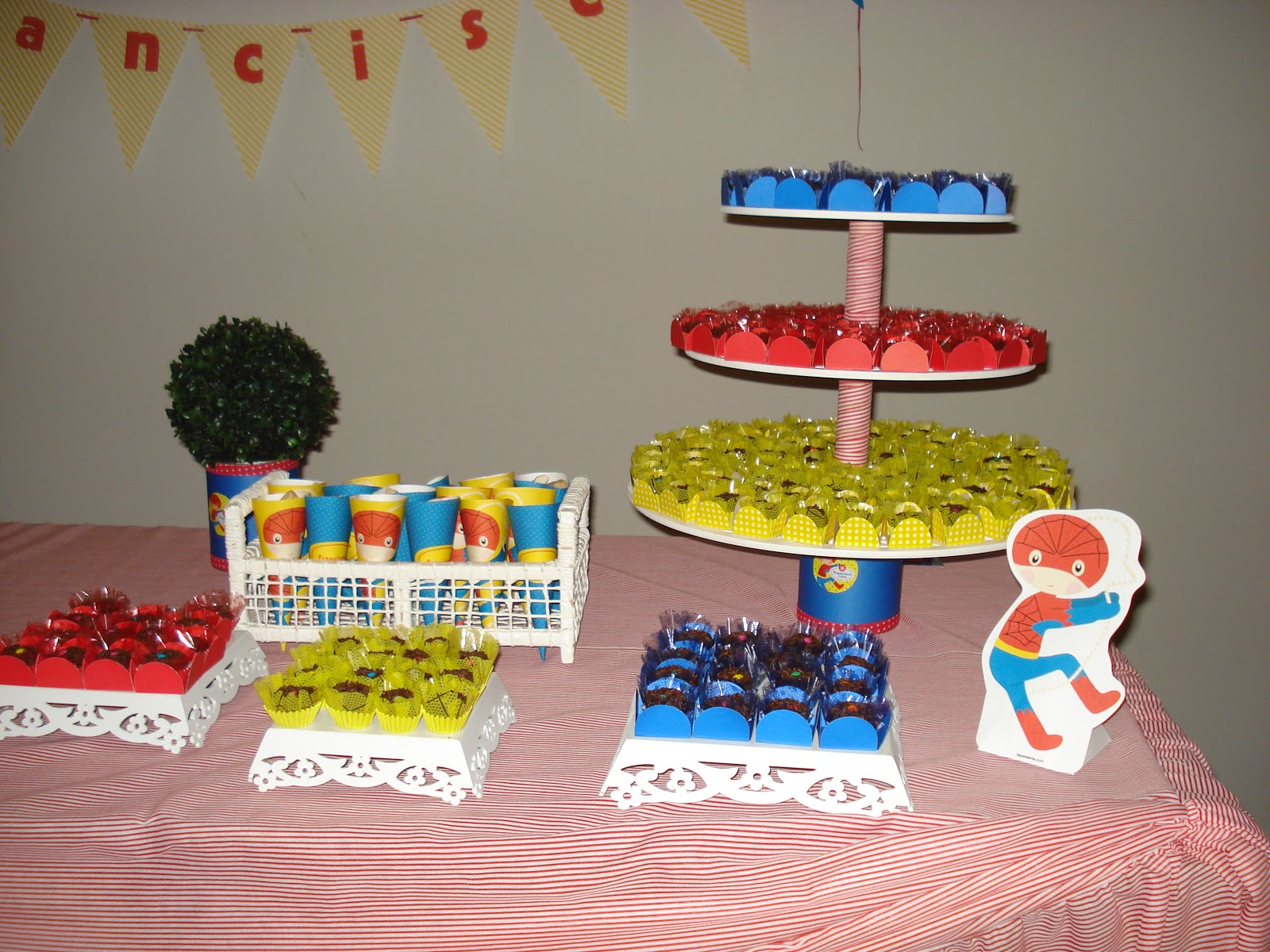 aqui, o tema escolhido foi o Homem Aranha. Minha irmã não queria nada grande e sofisticado (ela não é muito adepta a festas!) de modo que sugeri que fizéssemos uma festinha no estilo "homemade" no salão do prédio.