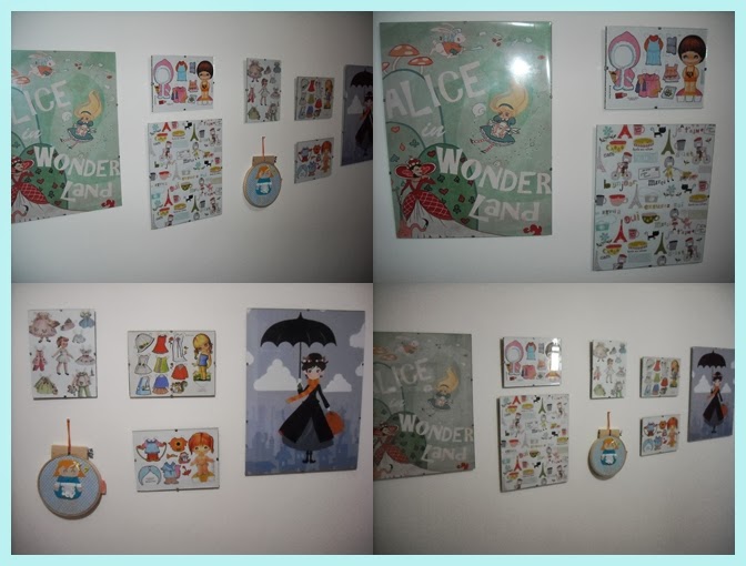 Minha filha é uma apaixonada por Paris (vai entender, pois nunca foi na cidade), então fuçei no Pinterest e achei uma imagem que poderia servir como papel de parede, presente etc. Depois foi a vez de apresentar as bonequinhas de papel da minha época e explicar como funcionava, e como eu gostava de cortar, montar e trocar as roupas. Ela se encantou também, e fácil mesmo foi achar um site chamado "bonequinhas de papel" e sua infinidade de opões de todas as décadas. Então, foi só apresentar pra ela e deixá-la escolher as bonecas mais interessantes. Minha filha se chama Alice, consequentemente ama o filme "Alice no País das Maravilhas" e sua várias versões. Baixei um poster antigo, beeeeeeeeeeeem antigo, do filme e pra arrematar imprimi uma imagem da Mary Poppins, outro filme que eu amava na minha infância e já foi apresentado à minha filhota. Não poderia ainda deixar de encomendar com minha querida Carol Grilo da FofysFactory um bastidor com o nome dela pra dar uma quebrada nos formatos retangulares que compunham a parede.