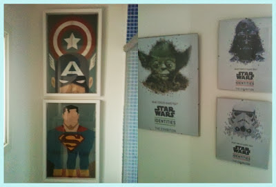 O menino curte horrores Star Wars com o vilão Darth Vader e sua legião do mal contra Luke Skywalker e sua legião do bem. Fuçando por aí (não me pergunte onde) achei umas imagens de vários personagens da trilogia, medi e mandei imprimir num papel especial e de tamanhos variados. Deixei os quadros maiores para meu filhote, pois ele tinha pouca parede e grande mesmo eu só tinha três, ao contrário do quarto da minha Alice, que tinha uma parede inteira pra brincar de decorar. Assim ele escolheu uma imagem dos soldados de Darth Vader, outra do próprio vilão e a última do Mestre Yoda. Feliz , feliz mesmo ele ficou quando viu os quadros em cima da cama.