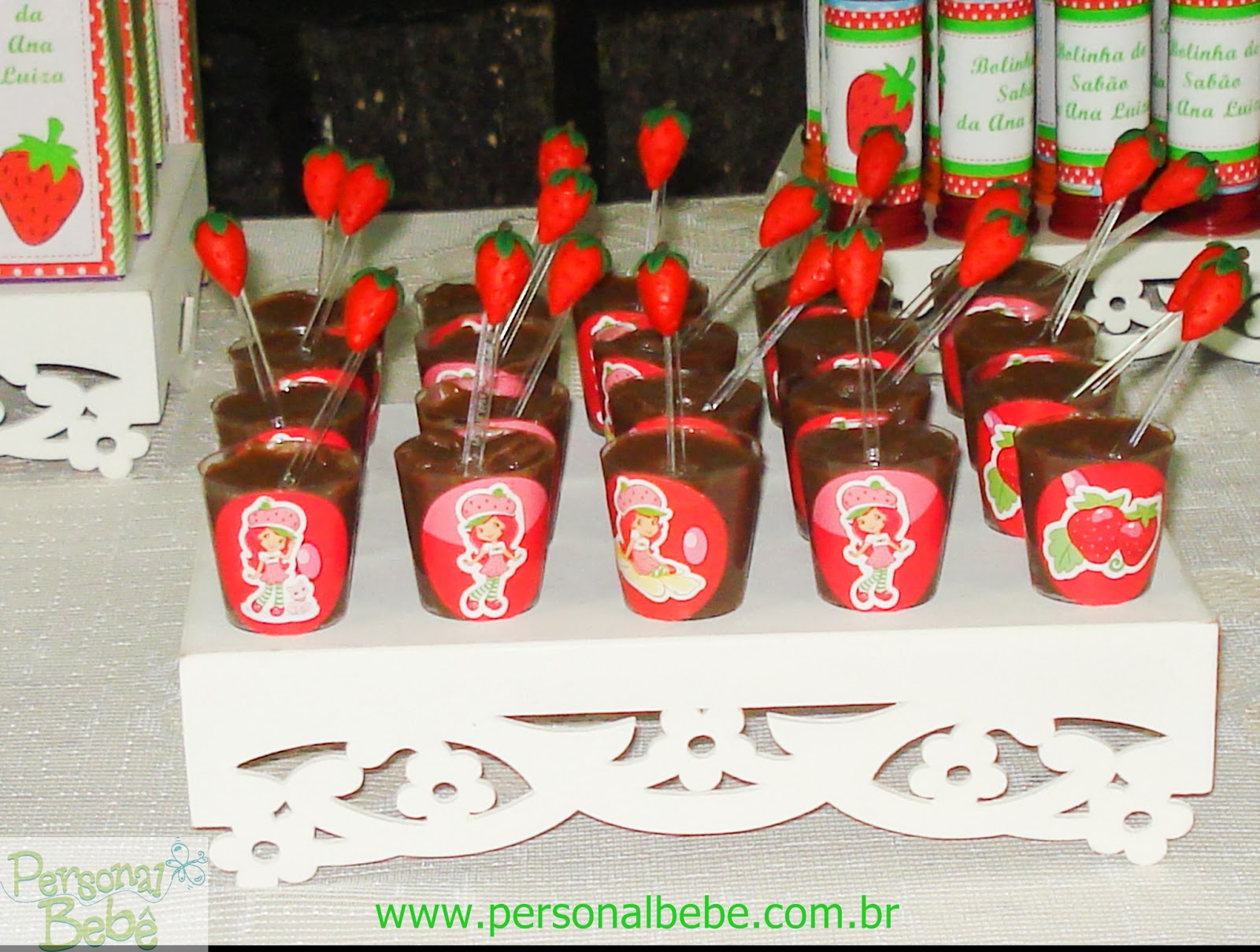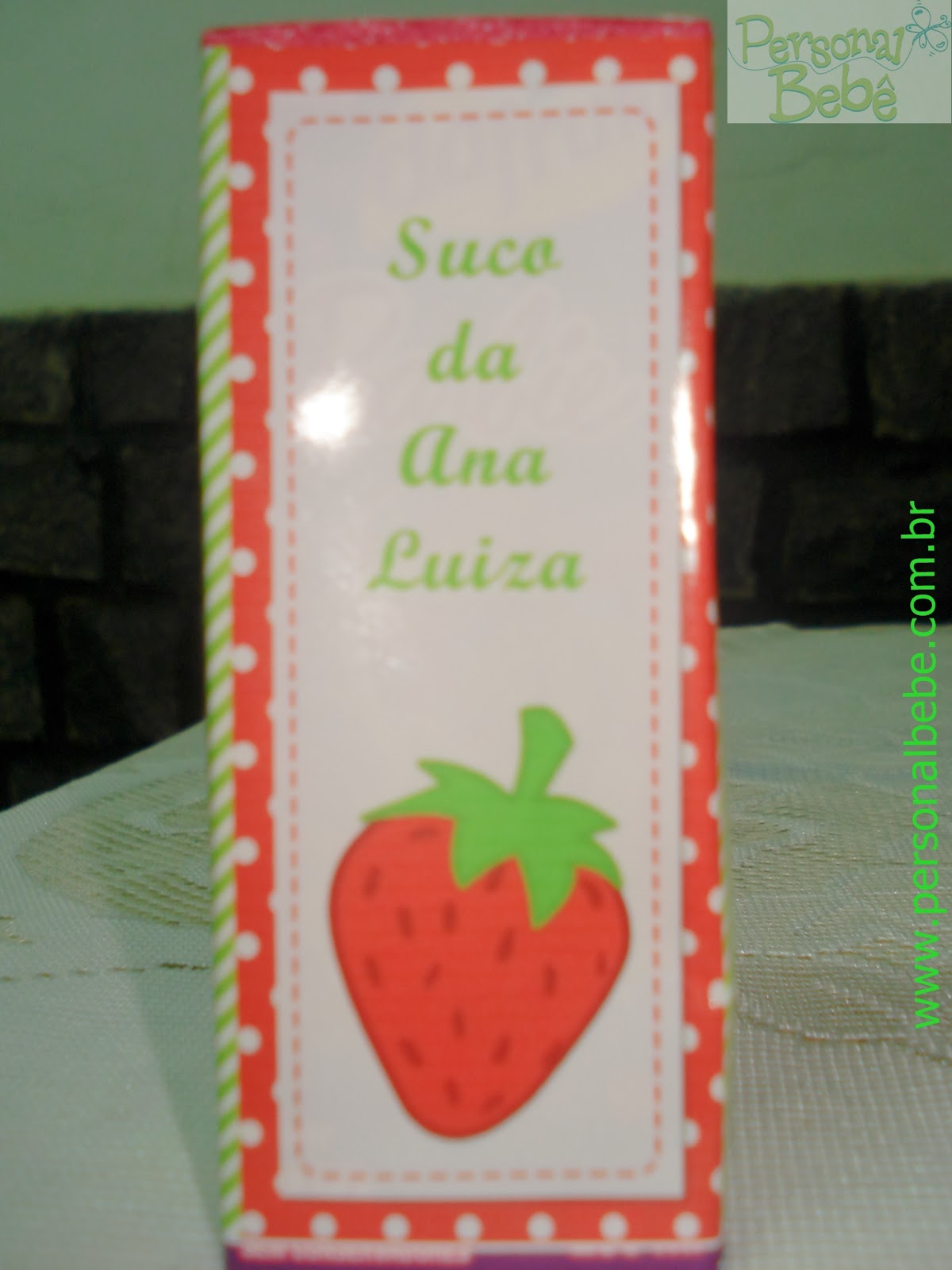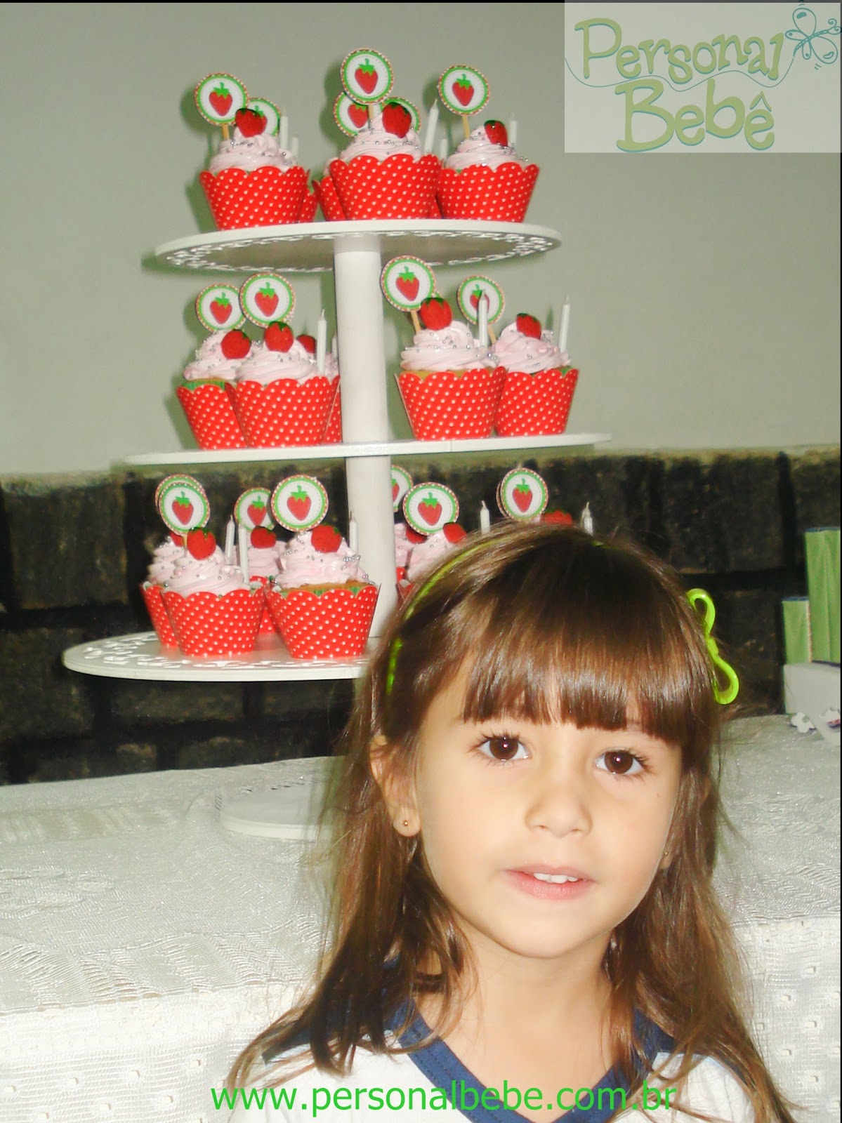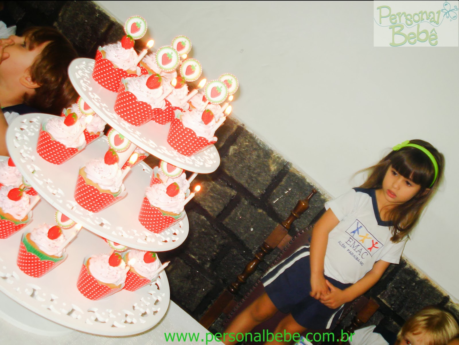 Além dos cupcakes feitos pela querida e talentosa Dani Dantas, mandei fazer ponteiras em formato de morango para as colheres do brigadeiro, tags e rótulos para os salgadinhos, sucos e bolinha de sabão para personalizar o tema escolhido.