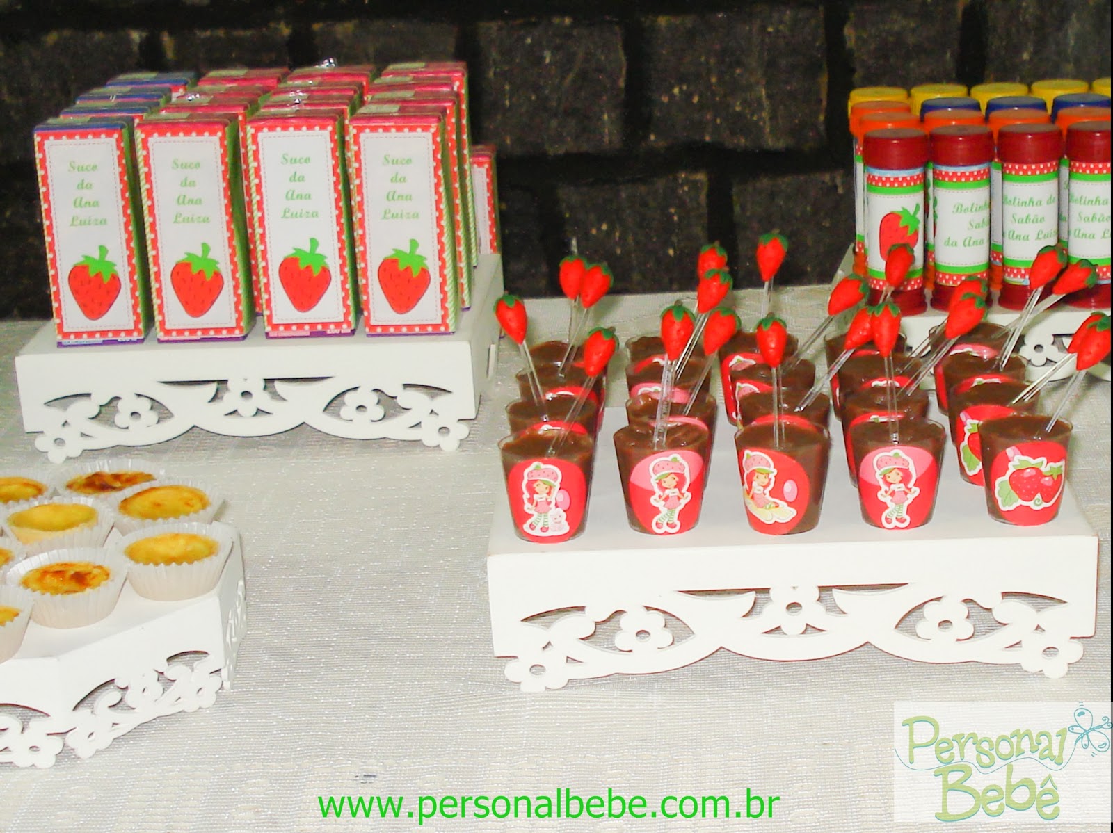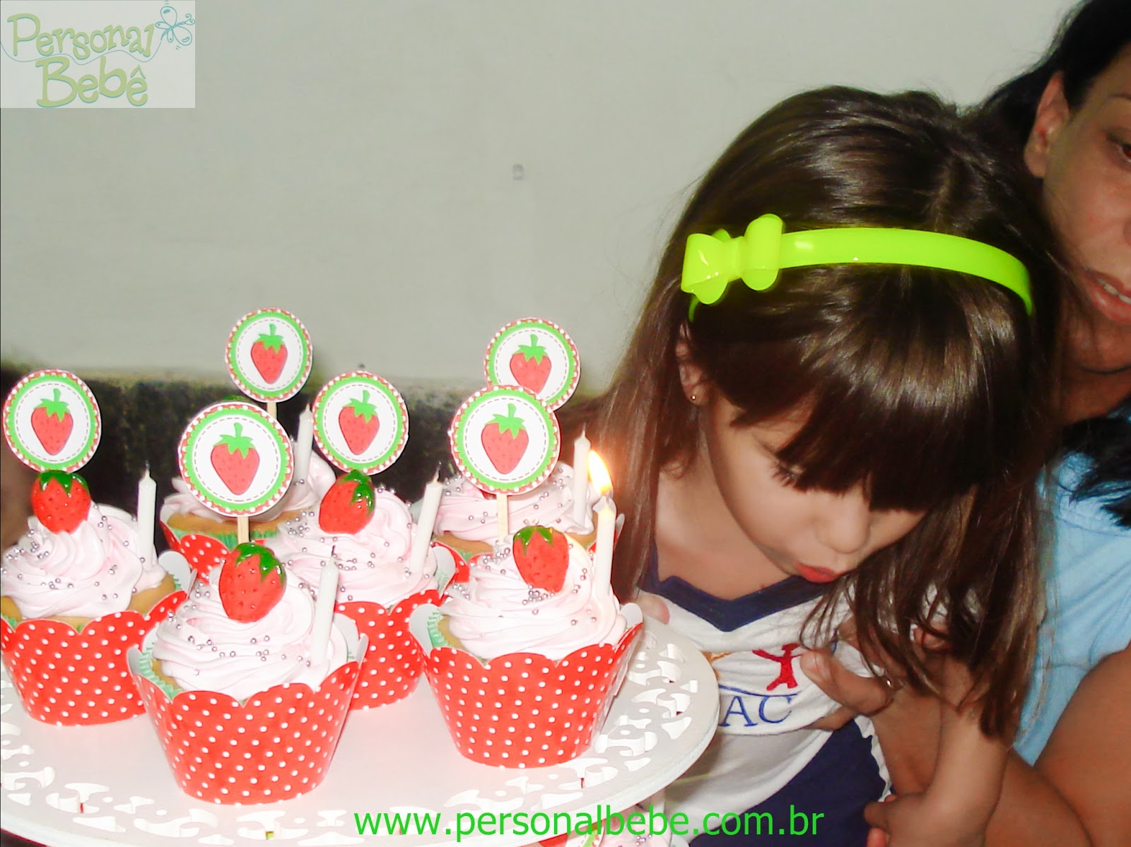 Além dos cupcakes feitos pela querida e talentosa Dani Dantas, mandei fazer ponteiras em formato de morango para as colheres do brigadeiro, tags e rótulos para os salgadinhos, sucos e bolinha de sabão para personalizar o tema escolhido.